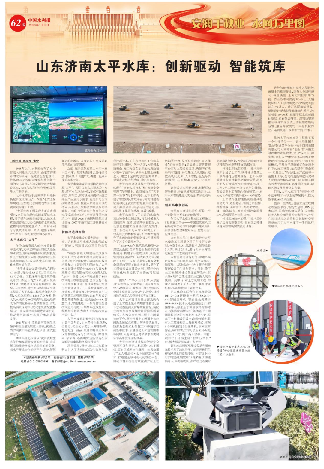 ? ? ? ?1月5日,《中國水利報》刊登的《山東濟南太平水庫:創(chuàng)新驅(qū)動 智能筑庫》通訊稿件中,對濟南城投集團建設(shè)的太平水庫工程的重要性以及科技創(chuàng)新方面的突出表現(xiàn)進行了報道。
